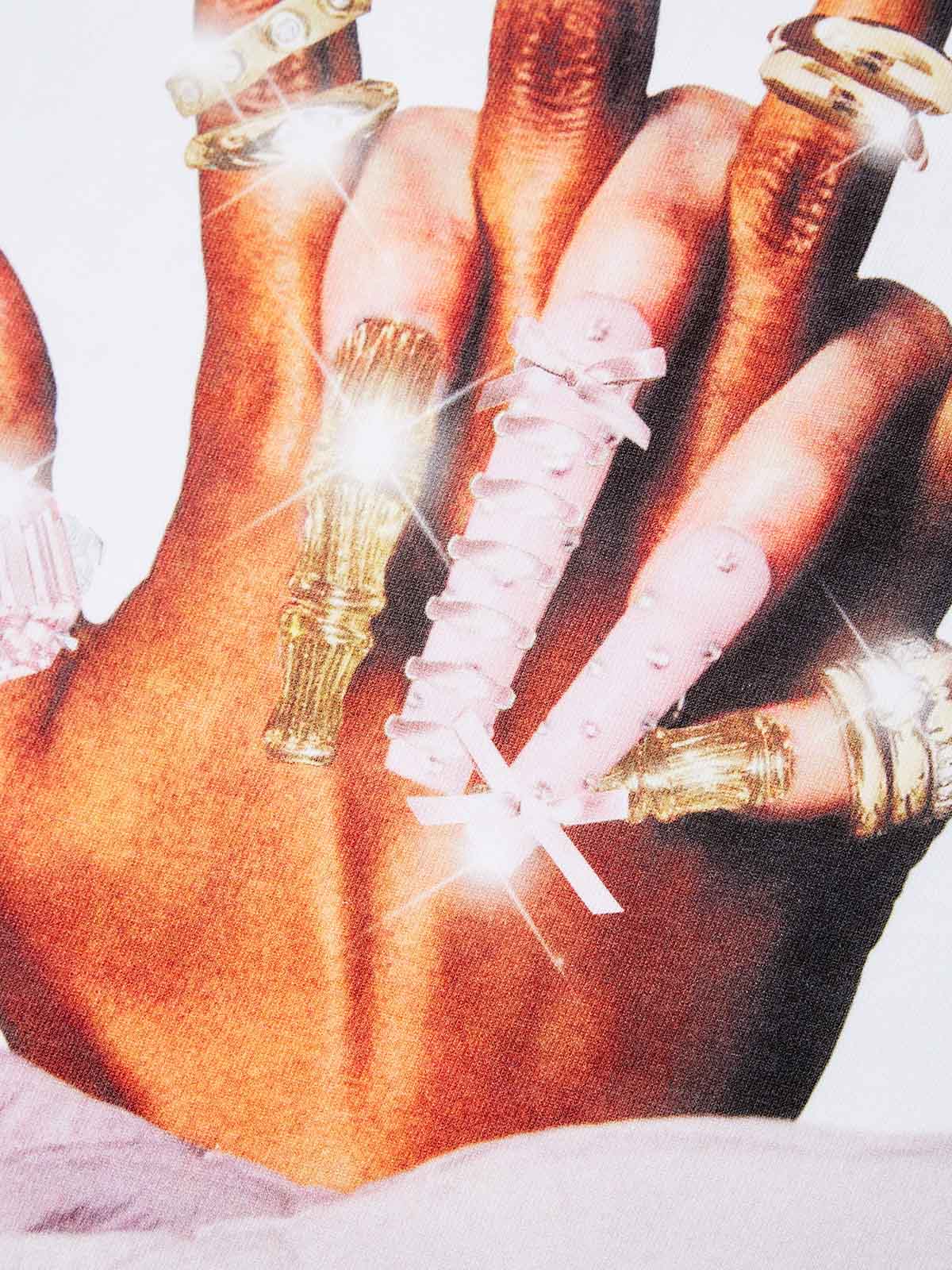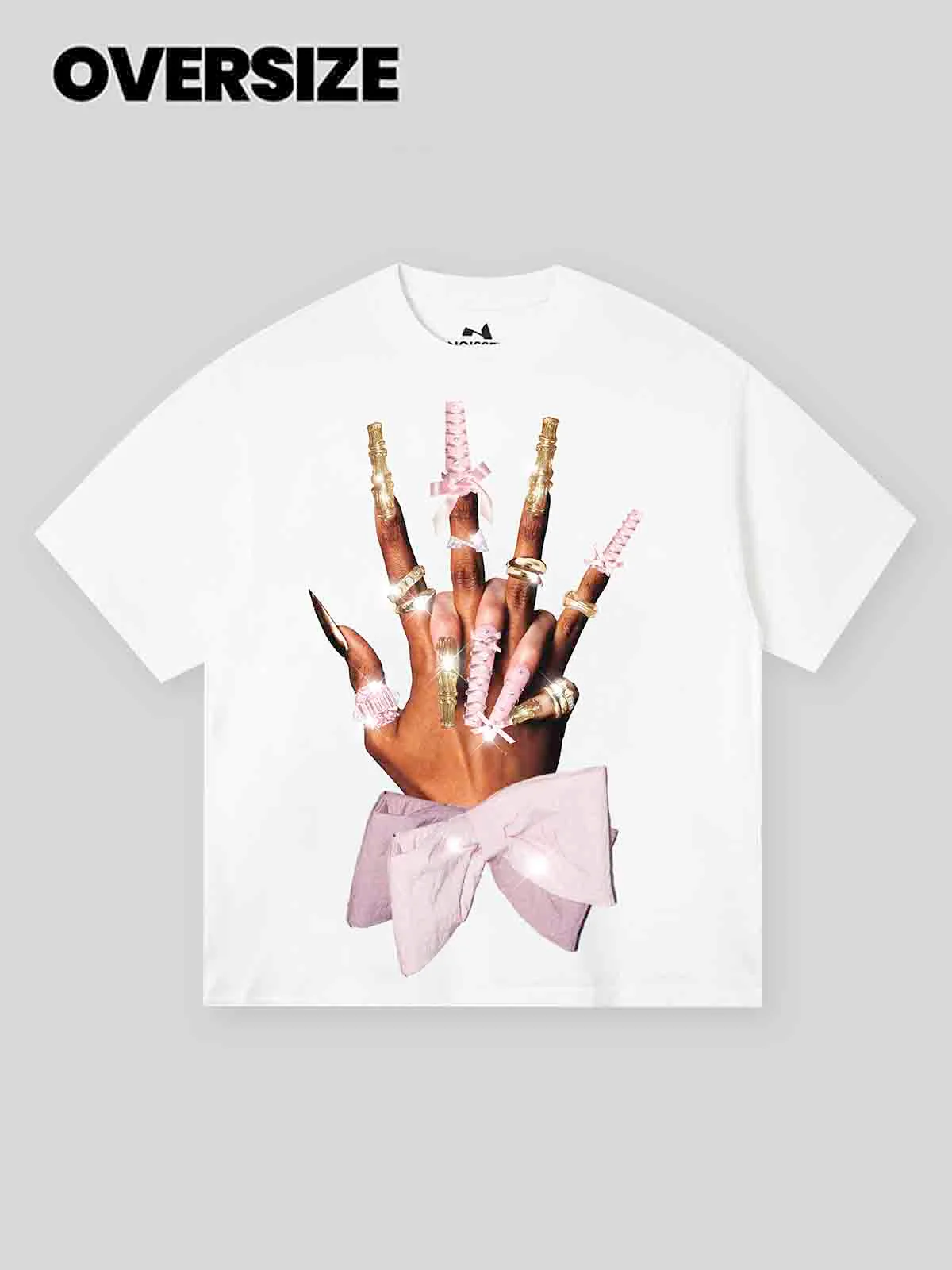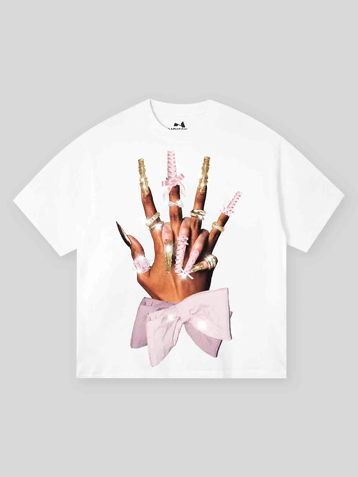 Gold bowtie nail art design, stylish T-shirt, showcasing personal flair.