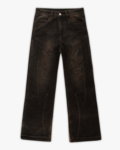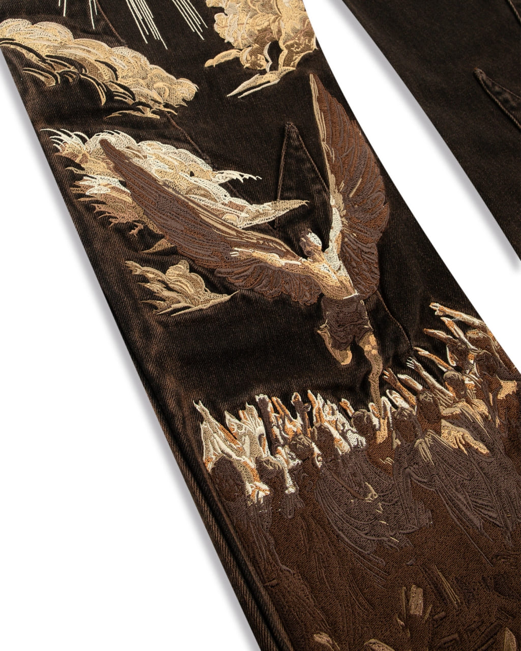 Cut in a deep brown denim with a soft thigh fade. Across the back legs, features a brown-toned 1,000,000+ stitch embroidery, inspired by The Lament of Icarus painting. Finished with custom panelling and a debossed leather tab featuring a golden-ratio 'Vescartes' logo.