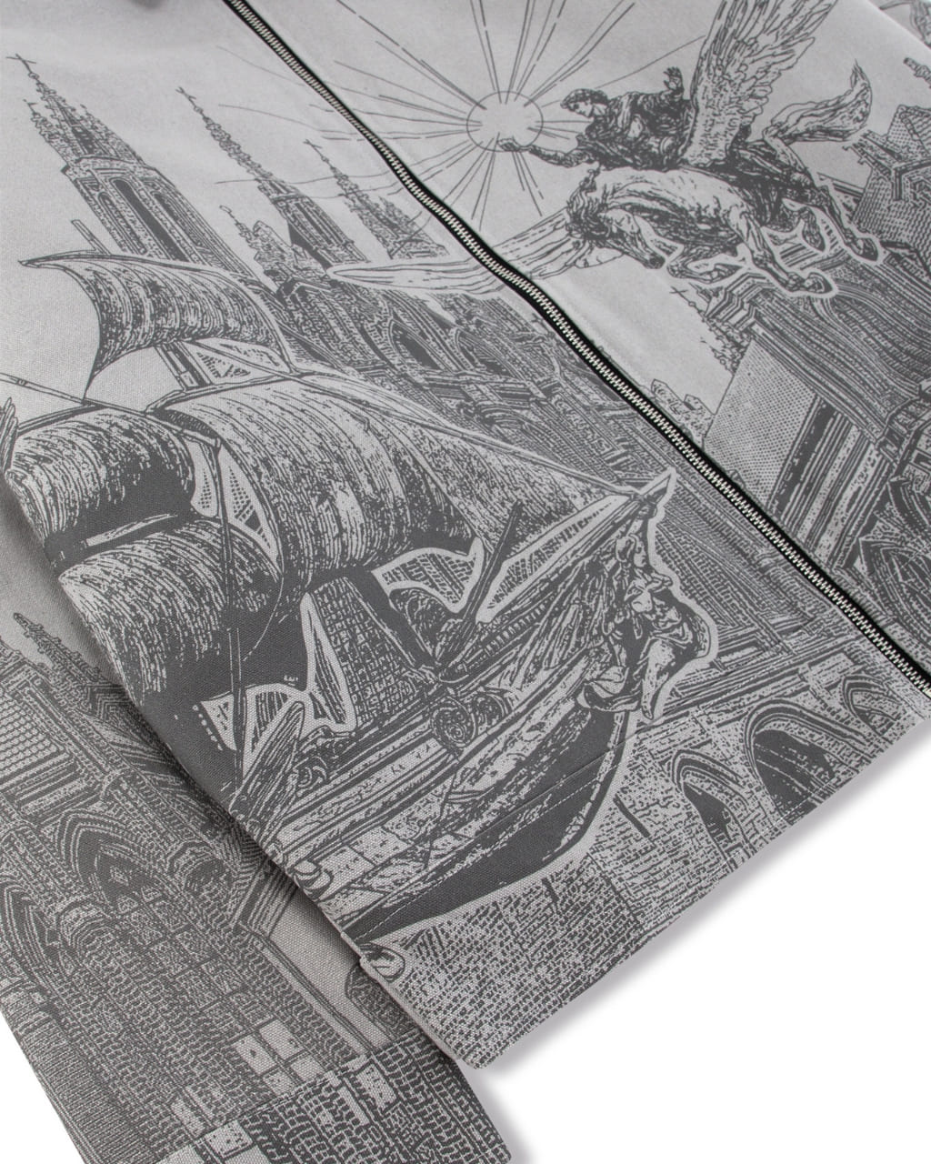 Crafted from grey cotton canvas, this jacket features a striking print of Hercules riding a winged horse through a mythological skyline. Vescartes’ signature hardware and functional waist adjusters complete the piece with subtle luxury.